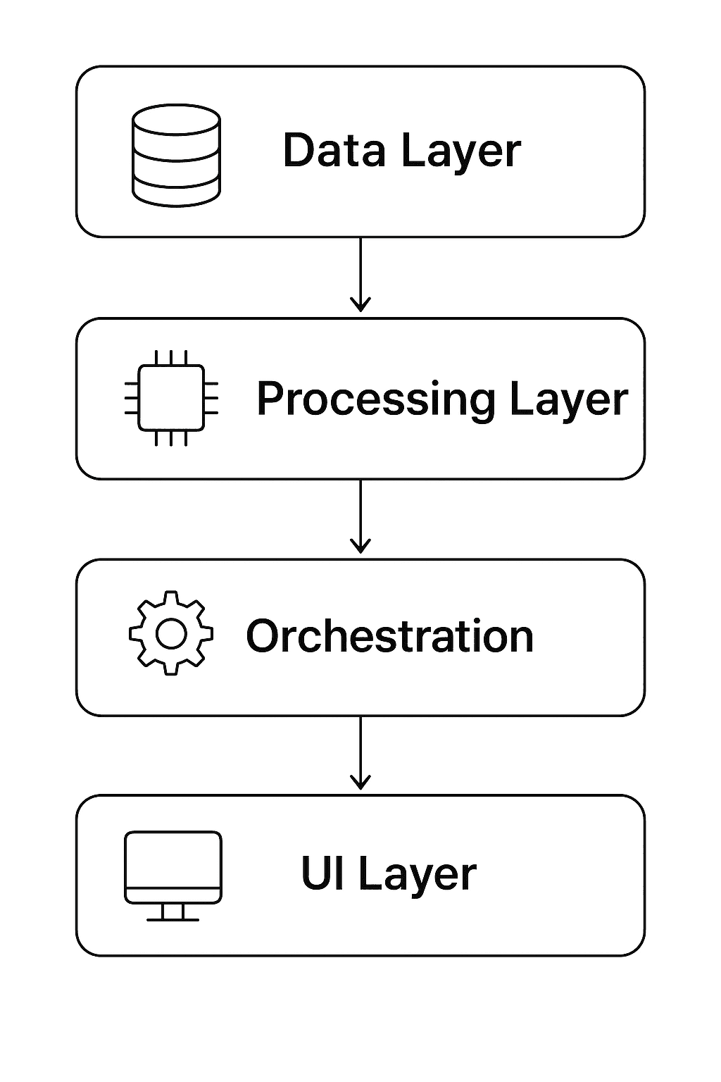 Without proper architecture, such systems quickly become fragile and expensive to scale. That’s why leading organizations are adopting layered architectures that helps in separating responsibilities across data, processing, orchestration, and user interaction layers.