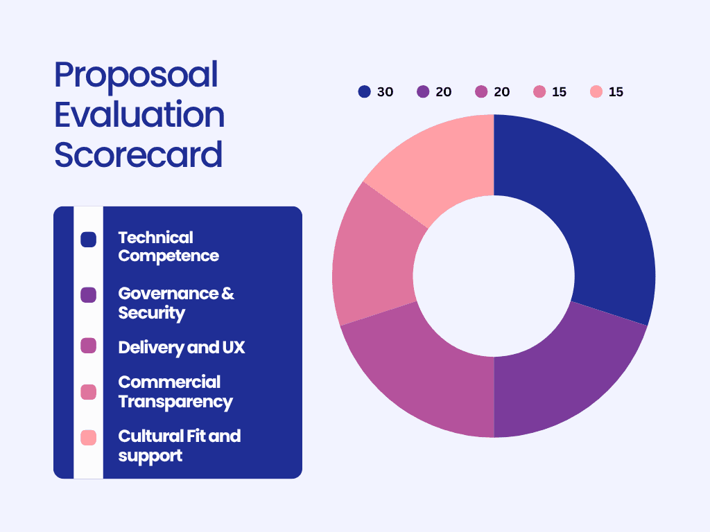 Commercial transparency (15%). Clear milestones, change-control process, and licensing/TCO guidance.