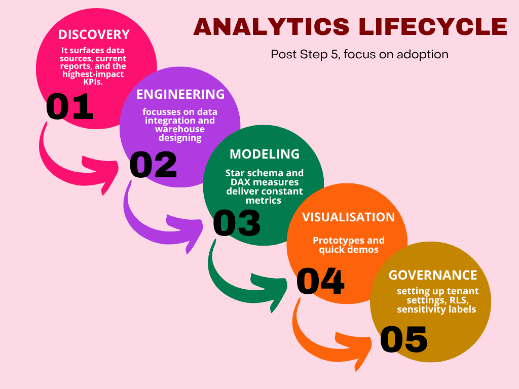 A mature engagement follows the analytics lifecycle: discovery → engineering → modeling → visualization → governance → adoption. Expect the provider to blend these skills, not just deliver a one-off report.