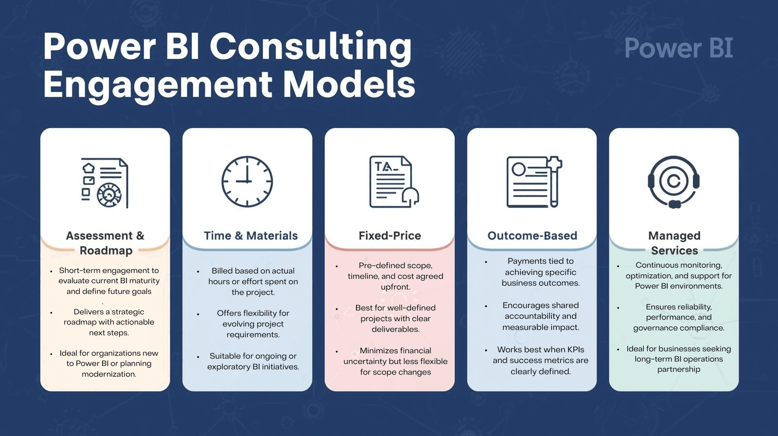 Handover & CoE enablement. Beyond code, a strong engagement includes training, runbooks, and a Center of Excellence playbook so your team keeps improving dashboards after the consultants leave.