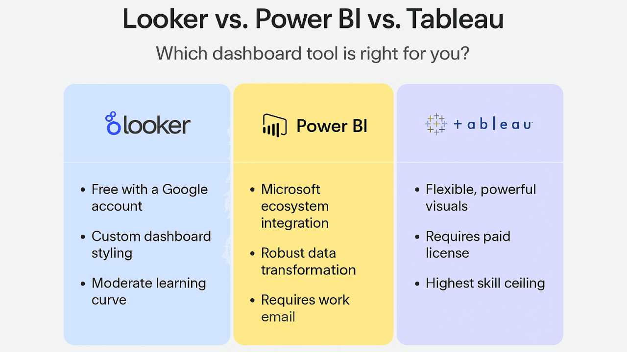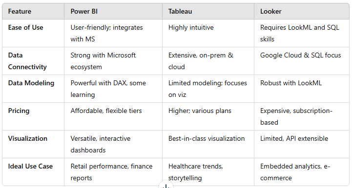 A: Power BI and Tableau are strong for self-service analysts; Looker is more governed and developer-driven.
