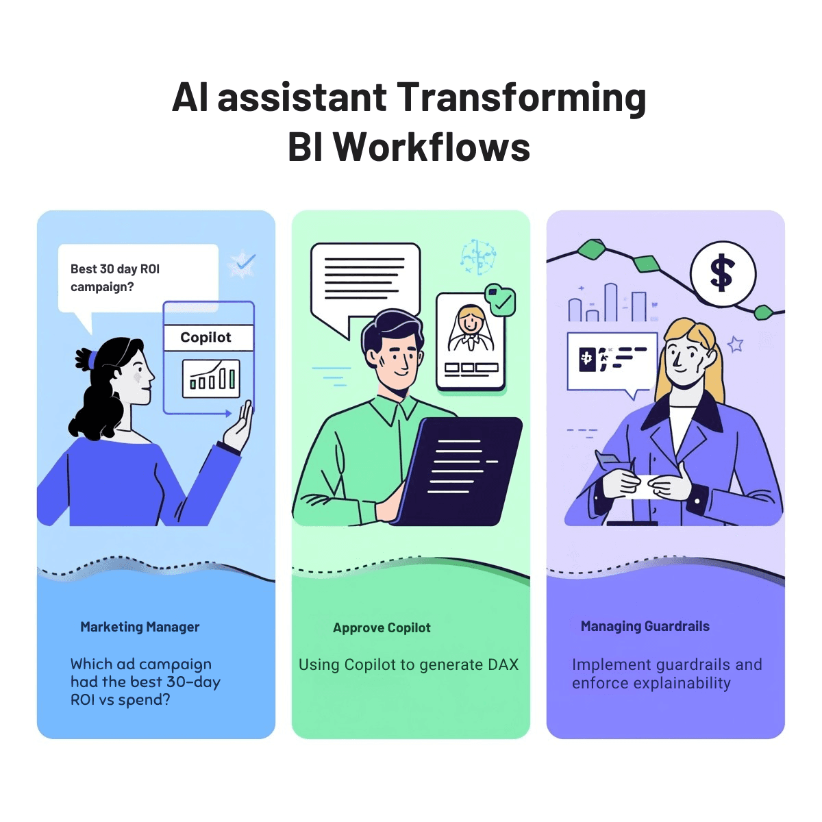 What’s new: Copilot-style assistants are being embedded directly into BI platforms (lookups, narrative outputs, DAX/SQL generation, and multi-step analysis flows). These agents let a marketing manager ask, “Which ad campaign had the best 30-day ROI vs spend?” and get an annotated visual plus next-step recommendations. Microsoft’s Copilot features in Power BI and Fabric are a prominent example of this direction.